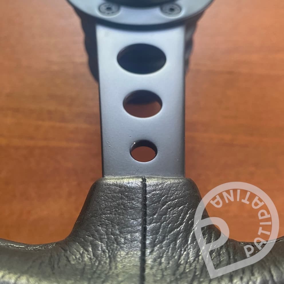 And below it reads: In foam with leather grain, Spokes matt black or matt chrome. And next to it – that’s the actual black Petri sports steering wheel.